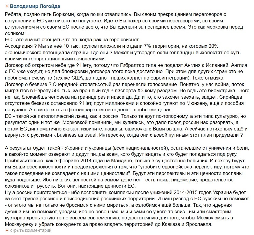Вопль души украинца, у которого кастрюля на секунду отлипла от суперклея и до него дошло то, о чем его три года назад предупреждали кляты москали. И теперь всю свою злость от того, что его таки нае...ли, он собирается направить на... правильно! - клятых москалей. Уровень переможной интоксикации в последнем абзаце зашкаливает.