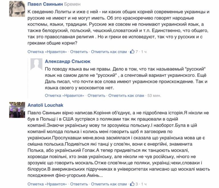 «Объединяют корни, а не поддельная история. Я никогда не был в Польше и в США и встретился с поляками, так как работали в одной компании. Зная украинский язык, ты поймешь польский. И наоборот. Была в этой компании молодая полька. И вот она мне говорит, чтобы я заговорил по-украински. Прослушав меня, она засмеялась и сказала, что украинский язык это смешной польский. Посмотрите, какие танцы у славян, они энергичны, знаменитая Полька, или украинский Гопак. А теперь присмотритесь, как танцуют москали: хороводы медленные. Кто знает украинский, но никогда не слышал русский, ничего не поймет, что говорит москаль. Значит, славяне — это поляки, украинцы, чехи, словаки и белорусы. В американских учебниках в университетах написано, что москали имеют происхождение финно-угорское. Аминь …»