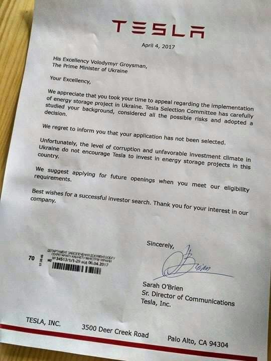 Ответ Гройсману прислал какой-то чиновник департамента компании по связям с общественностью (вот вопрос: Гройсман для компании «Tesla» – общественник, активист?). В ответе говорится: «Заявка Украины на реализацию проекта в области возобновляемой энергии не принята по причине неблагоприятного инвестиционного климата и высокого уровня коррупции». Точка.