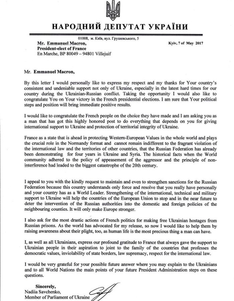 Депутат Верховной рады Надежда Савченко попросила новоизбранного президента Франции Эммануэля Макрона ужесточить санкции против России. Об этом политик сообщила в своем аккаунте Facebook, приложив копию письма.