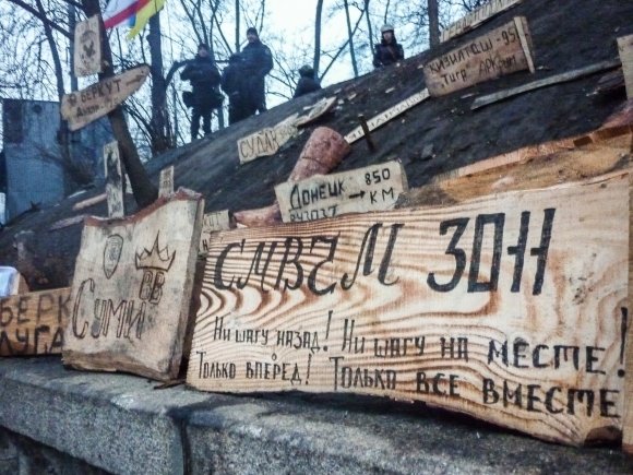 На улице Грушевского воцарилось пермирие. Бойцы "Беркута" коротают время, греясь у костров и бочек с огнем, рубят дрова. В перерывах между дежурствами силовики занимаются творчеством.