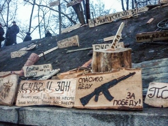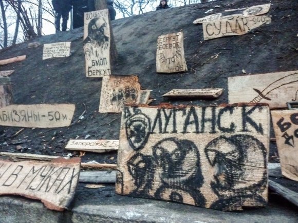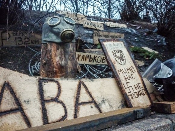 Творческий "портрет" донецкого Беркута. Таблички с расстояниями до городов напоминают бойцам о доме.