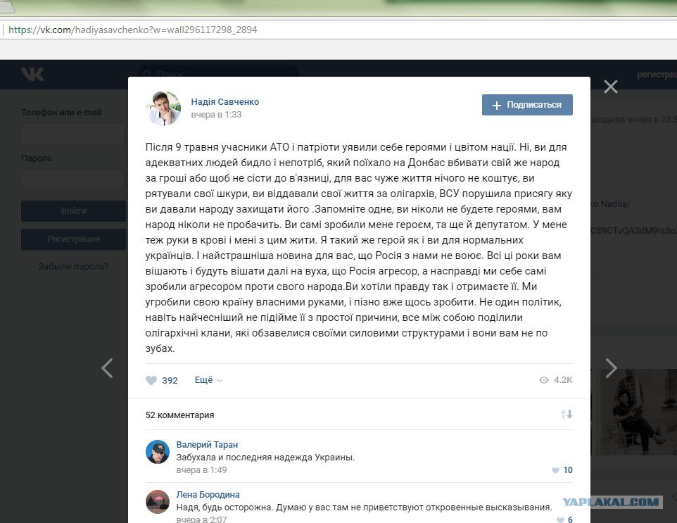 "После 9 мая участники АТО и патриоты возомнили себя героями и цветом нации. Нет, вы для адекватных людей быдло и отребье, которое поехало в Донбасс убивать свой же народ за деньги или чтобы не сесть в тюрьму. Для вас чужая жизнь ничего не стоит, вы спасали свои шкуры, вы отдавали свои жизни за олигархов", - говорится в гневном послании Савченко.