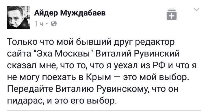 А теперь к повидлу. Главред "Эха Москвы" Виталий Рувинский выложил скрины истерики Муджабаева с пояснением. Очень познавательное чтиво. Судя по соплям и слюням Муждабаева, я в своих рассуждениях выше не очень далёк от истины. По ходу меджлис в истерике и раздумьях о бесцельно прожитых годах и про*баном полуострове. А вообще знаково - если истерят особы приближённые, значит делишки реально швах.