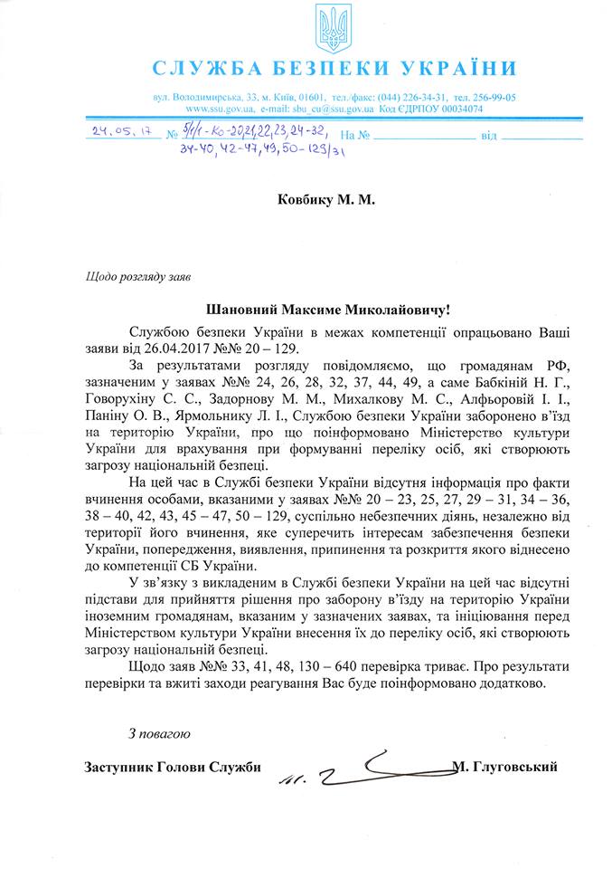 «Похоже, что защита украинского информационного пространства от одиозных российских артистов больше беспокоит общественность, чем СБУ. Ведь мы не первый раз подаем в Службу наш список артистов-рашистов. И только после того, как активисты движения «Відсіч» подали в СБУ более 600 персональных заявлений на каждого рашиста, это заставило Службу немного зашевелиться. Впрочем, большинство рашистов до сих пор не внесены в «черный список». Мы требуем от СБУ прекратить применять двойные стандарты различных рашистов — всем им не место в Украине, а место в «черном списке»., — заявили в организации. Источник