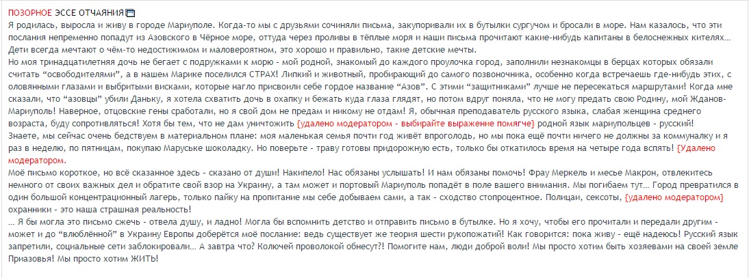 Знаю, что в моем родном Мариуполе жизнь это пытка. Город, как концентрационный лагерь. А главные убийцы и насильники, батальон "Азов" пришили себе название "вызволытели", только непонятно кого и от чего...