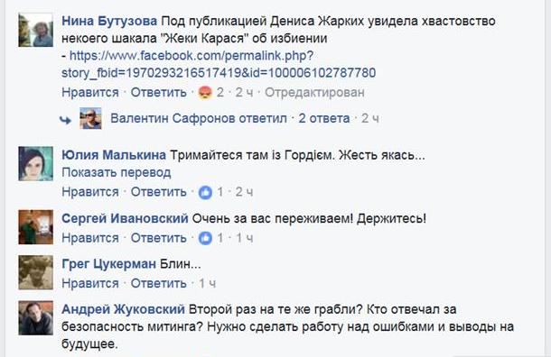 Интересно, что главарь неонацистской группировки С14 Евгений Карась, ранее анонсировавшей нападение на акцию социалистов, прямо под материалом активиста «Социалистов» Дениса Жарких хвалится тем, как его подручные избили участников мероприятия.