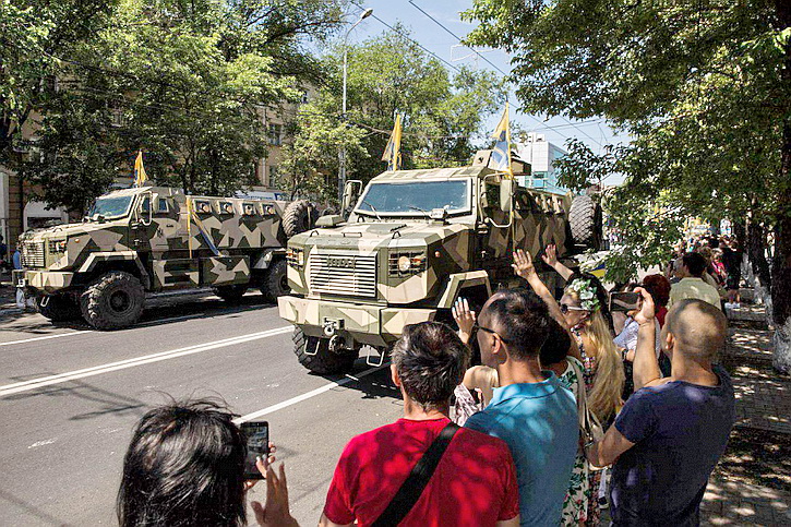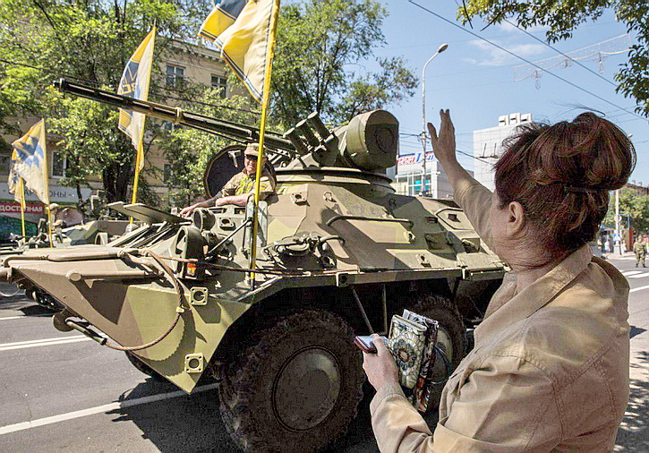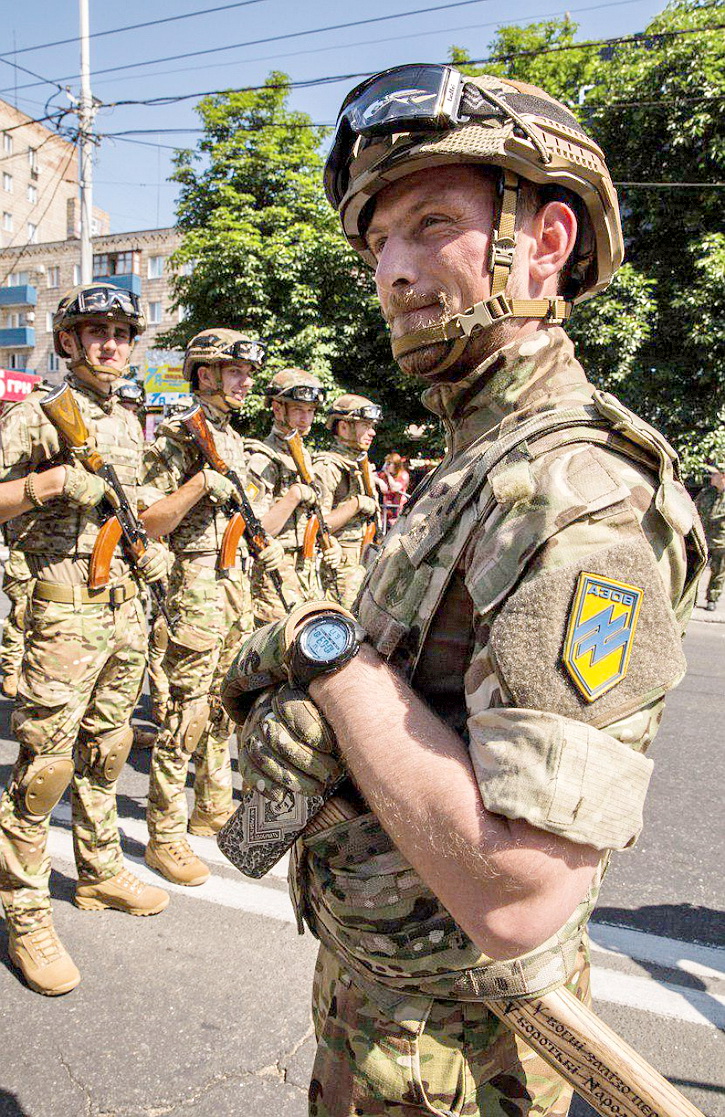 Неонацистский полк «Азов» провел сегодня под стилизированными свастиками «Волчий крюк» парад, посвященный третьей годовщине захвата Мариуполя, жители которого на референдуме высказались в поддержку ДНР.