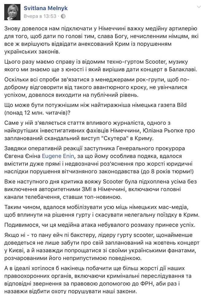 "А в идеале хотелось бы, наконец, увидеть еще более жестокие действия наших правоохранительных органов, включая криминальные преследования и соответствующие обращения за правовой помощью к ФРГ, чтоб раз і навсегда отбить охоту нарушать наши законы."
