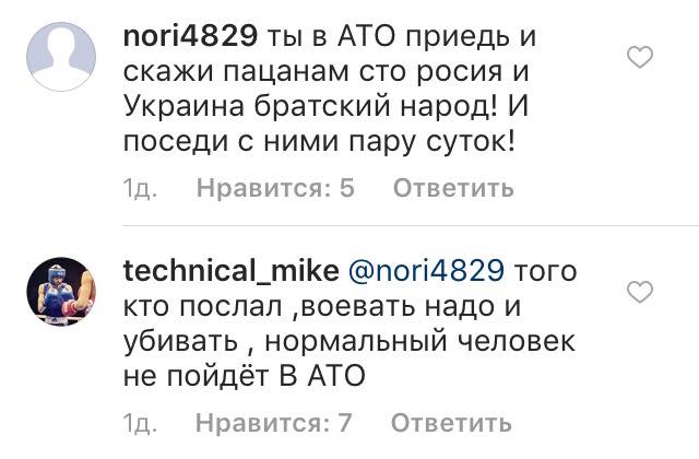 «Того, кто послал воевать, и надо убивать. Нормальный человек в АТО не поедет», — ответил ему боксер.