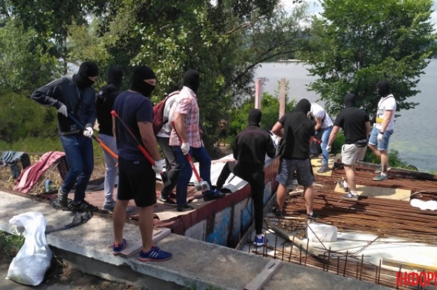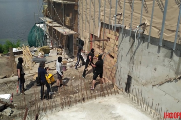 Инцидент имел место утром 24 июня на Днепровской набережной. Люди в масках средь бела дня стали крушить забор и постройки гостинично-ресторанного комплекса "Каравелла".