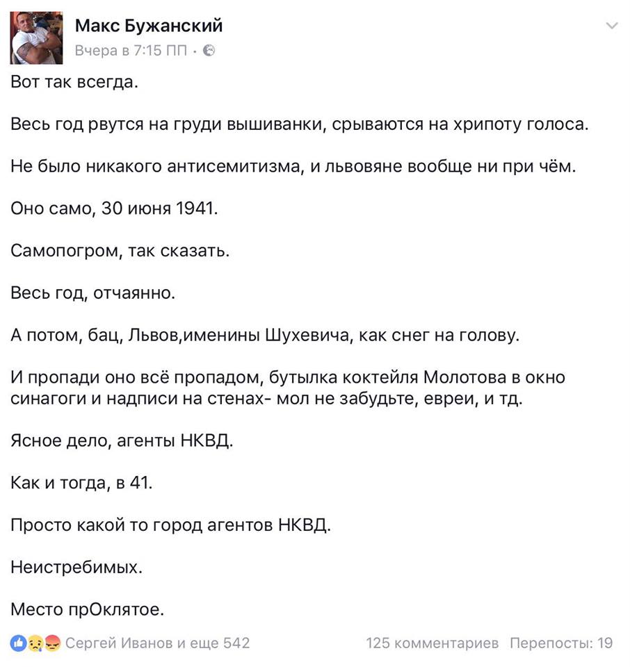 И, да! Тем, кто опять потащит евреев и прочих расово неправильных на расстрел, будет абсолютно наплевать даже на самую сильную проукраинскую позицию своих потенциальных жертв. И хоть до уср@чки кричи, что Крым — это Украина, а на Донбассе воюет российская армия — свою пулю ты всё равно получишь. Если воЕны света не прибьют тебя раньше тем, что под руку подвернулось. Просто потому, что им не нравится твоя челюсть или нос.