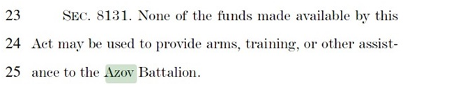 "Никакие средства, выделяемые настоящим актом, не могут быть использованы для предоставления оружия, обучения и другой помощи батальону Азов", - говорится в документе.