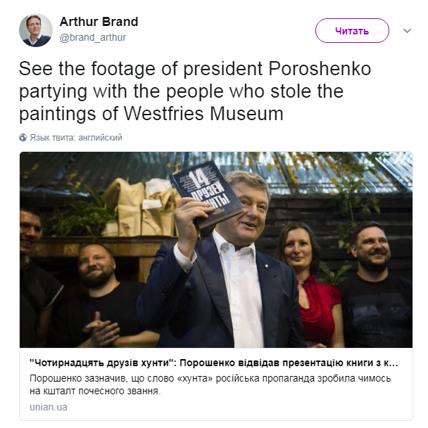 Сыщик из Нидерландов Артур Бранд, который занимается поиском утраченных шедевров живописи, обвинил украинского лидера в связях с националистом-вымогателем Борисом Гуменюком.