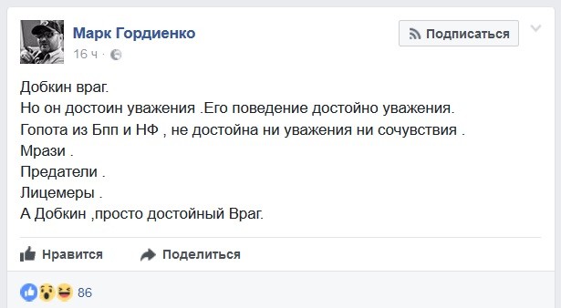 «Добкин враг. Но он достоин уважения. Его поведение достойно уважения. Гопота из Бпп и НФ, не достойна ни уважения, ни сочувствия. Мрази. Предатели. Лицемеры. А Добкин, просто достойный Враг», - написал он.