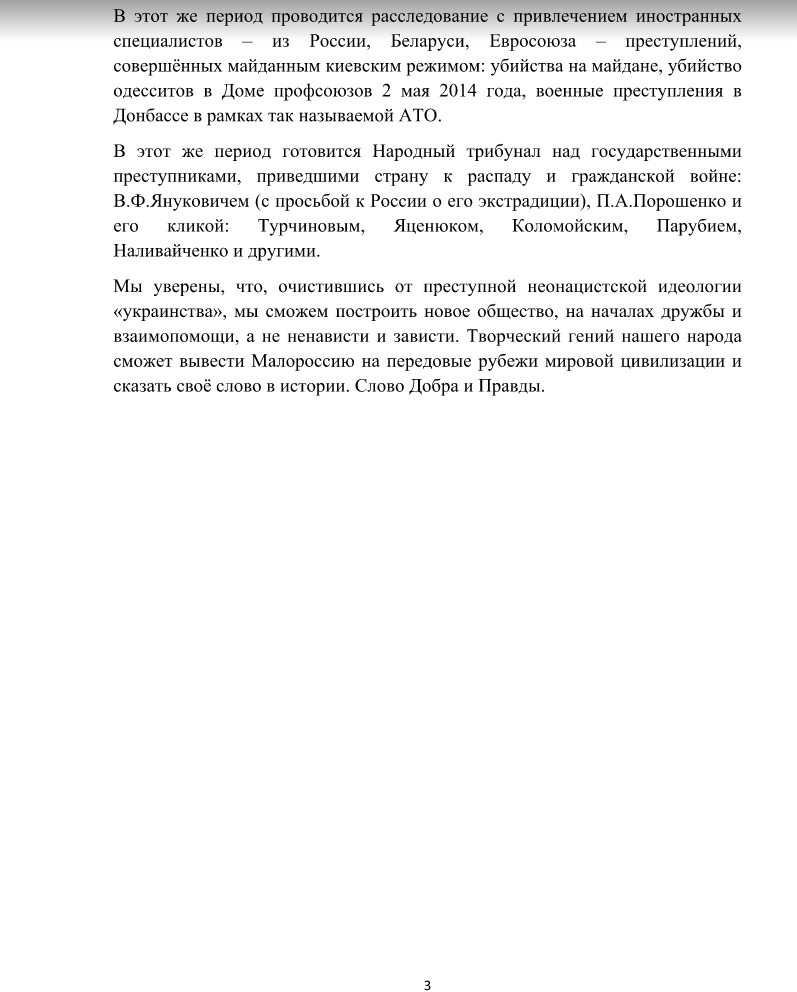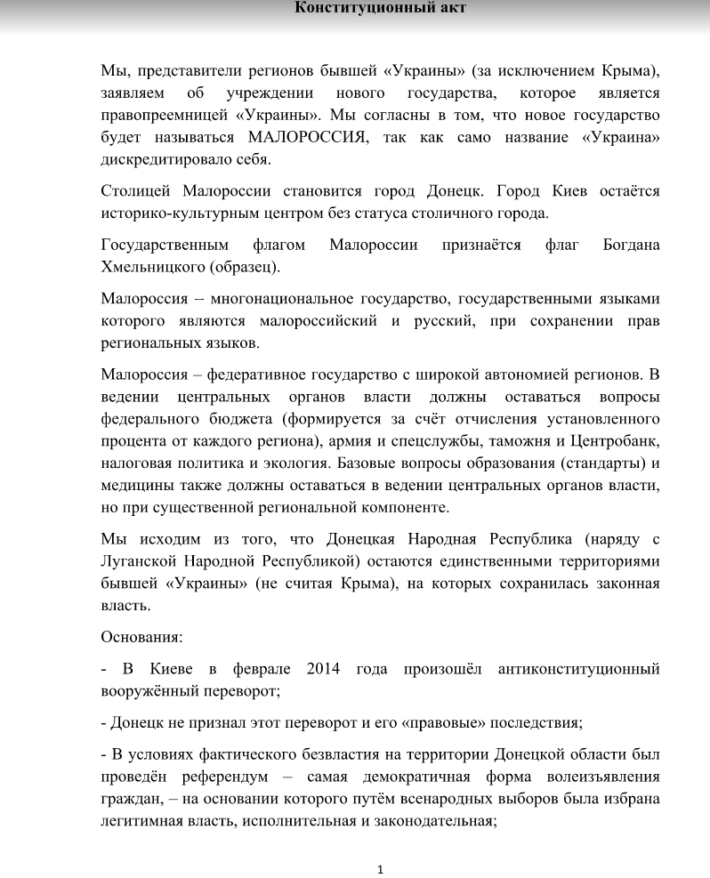 "Мы, представители бывшей Украины, заявляем об учреждении нового государства, которое является правопреемницей Украины. Мы согласны в том, что новое государство будет называться Малороссией, так как само название Украина себя дискредитировало. Столицей Малороссии становится город Донецк", — заявил Тимофеев, зачитывая конституционный акт.