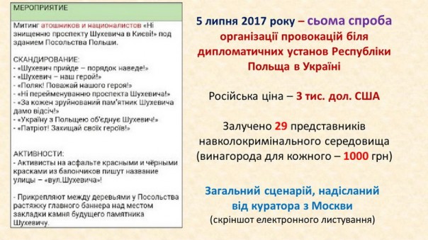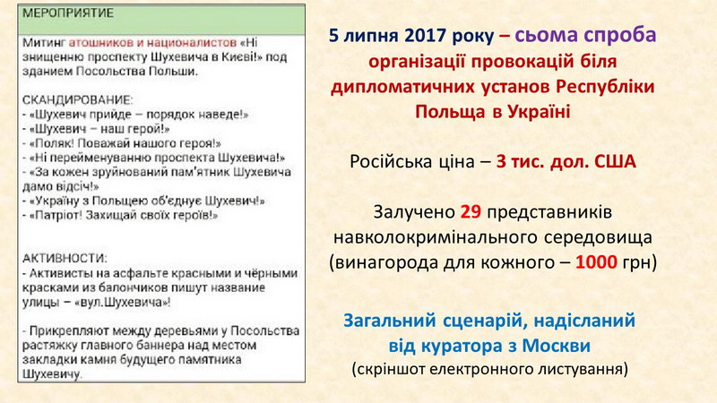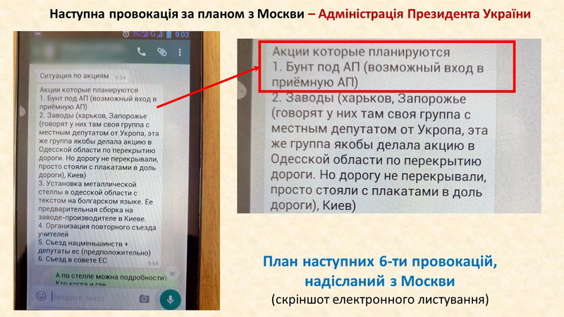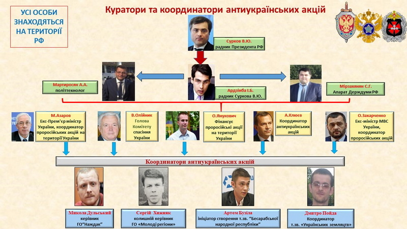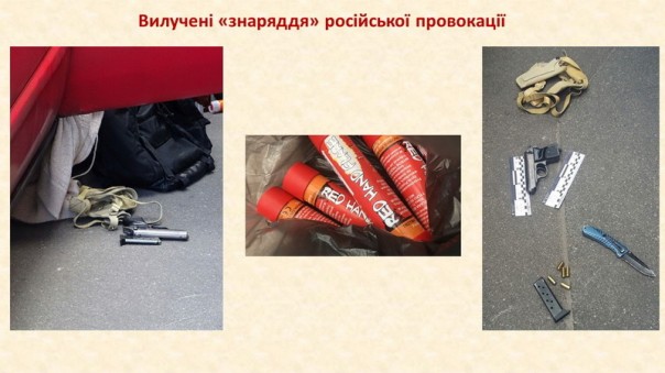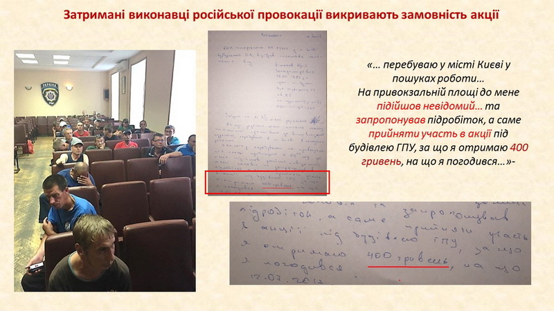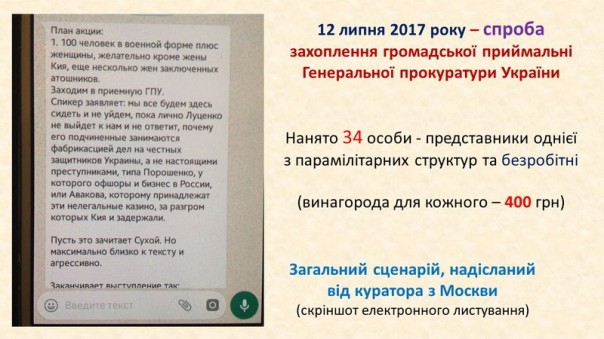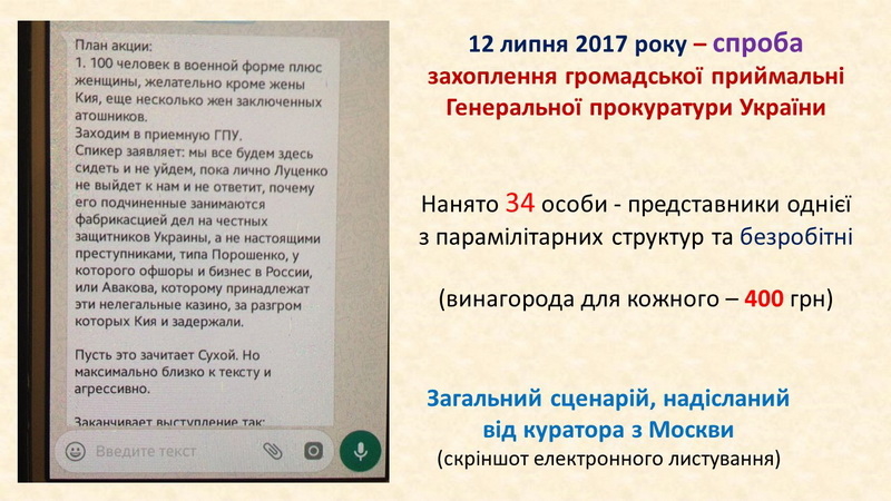 "12 июля по указанию российской стороны была организована попытка захвата общественной приемной ГПУ. По сценарию кураторов из Москвы, участники акции должны были захватить общественную приемную ГПУ, приковать себя наручниками внутри помещения, облить приемную изнутри принесенной с собой красной краской, развернуть плакаты с требованиями политического характера", - сообщил глава СБУ.