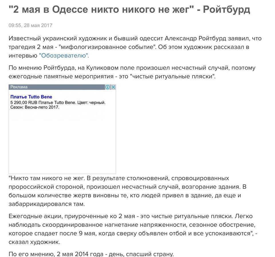 Знаменит тем, что 2 мая 2014 года, когда в одесском Доме профсоюзов были убиты 48 человек сообщил дезинформацию, которую растиражировали украинские СМИ, что там якобы погибли граждане России и Приднестровья и ни одного одессита. Через три года после убийства 48 человек назвал это день Днём Победы, а не скорби.
