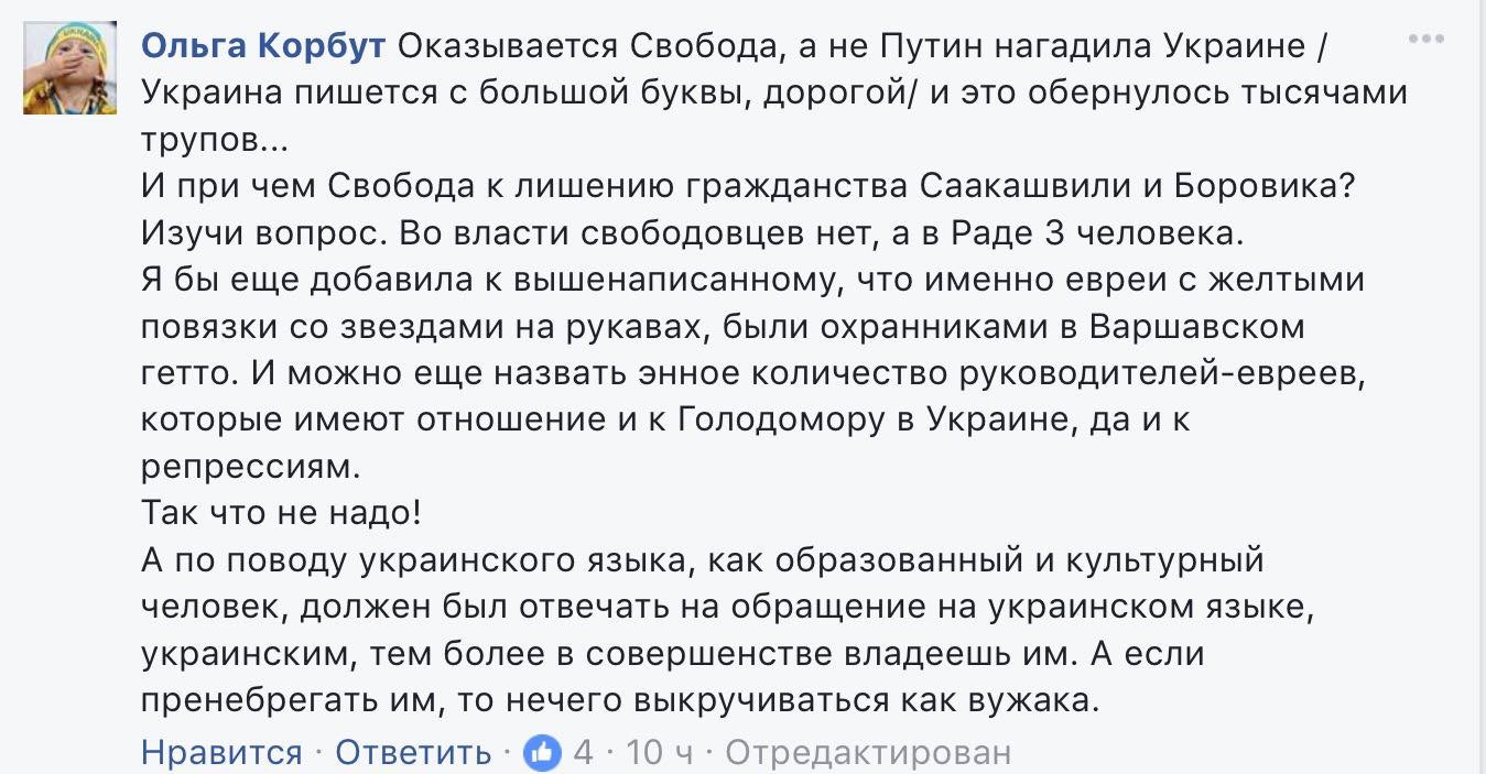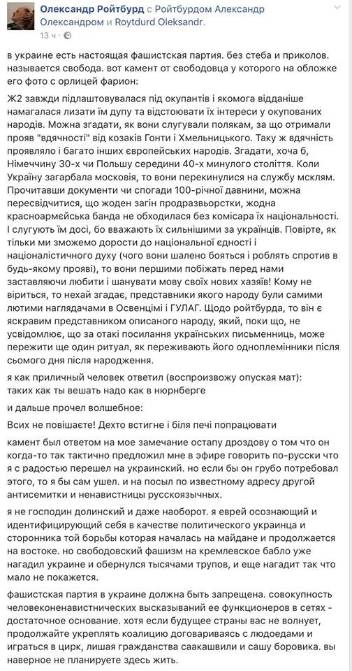 "я не господин Долинский и даже наоборот. Я еврей, осознающий и идентифицирующий себя в качестве политического украинца и сторонника той борьбы которая началась на майдане и продолжается на востоке. Но свободовский фашизм на кремлевское бабло уже нагадил украине и обернулся тысячами трупов, и еще нагадит так что мало не покажется. фашистская партия в украине должна быть запрещена. совокупность человеконенавистнических высказываний ее функционеров в сетях — достаточное основание. хотя если будущее страны вас не волнует, продолжайте укреплять коалицию договариваясь с людоедами и играться в цирк, лишая гражданства саакашвили и сашу боровика. вы наверное не планируете здесь жить."