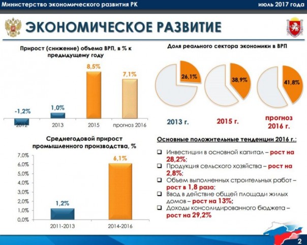 Министерство экономики Крыма сопоставило социально-экономические показатели республики до и после присоединения к России. В опубликованной презентации ведомства отмечается, что в 2012–2013 годах рост крымской экономики в среднем балансировал возле нулевой отметки, в 2015 году объем валового регионального продукта (ВРП) полуострова вырос на 8,5%, а в 2016 году — на 7,1%.
