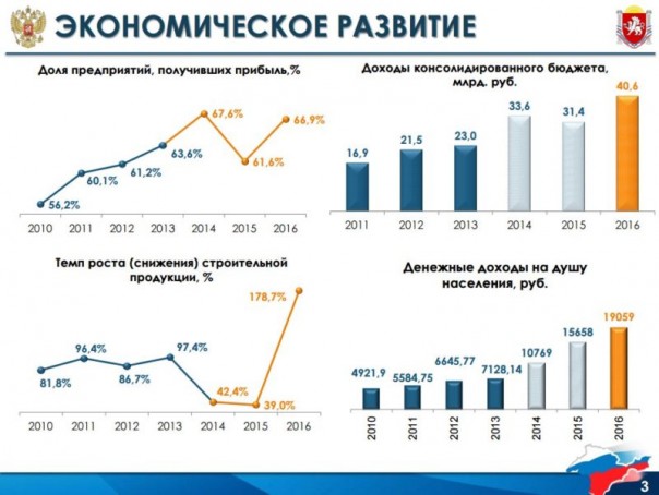 Промышленность полуострова в 2011–2013 годах росла в среднем на 1,2%, а в 2014–2016 годах — на 6,1%. Доходы жителей Крыма на 167% превзошли показатель 2013 года. В 2016 году доходы составили почти 19,1 тыс. руб. на душу населения, а в 2013 году составляли 7,1 тыс. руб.
