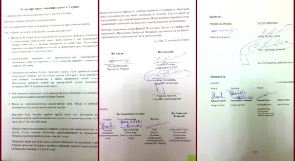 Но вполне понятно, что подписанты этого соглашения уже на следующий день забыли про свои подписи в классическом стиле "договора стоят не большое бумаги, на которой они написаны" и приветствовали свержение Януковича, которому лишь чудом (российского свойства) удалось ускользнуть от команды ликвидаторов. Вполне естественно, что как и расстрел "небесной сотни" нынешними узурпаторами власти, обстоятельства государственного переворота тщательно вычищаются из официальной украинской истории и тем более из европейских масс-медиа. Уничтожение этого документа, лишает Януковича важной улики при гипотетическом независимом разбирательстве обстоятельств государственного переворота на Украине, так как при рассмотрении, он сможет представить лишь копию, а оппоненты теоретически могут подвергать документ сомнению. Впрочем, на данном этапе линия поведения у хунты еще проще - "Янукович бежал, а значит мы взяли власть законно". Про данное соглашение они естественно вспоминать не любят, так как еще за день до переворота, они признавали юридически Януковича президентом и были готовы дожидаться выборов. Но реальные операторы госпереворота уже не готовы были ждать и была дана команда форсировать события, что обесценило все подписанные бумаги и открыло дорогу гражданской войне и отпадению от Украины части территорий.