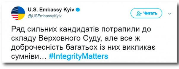 Хотя посол Йованович всего-лишь воспользовалась своим хозяйским правом и в открытую написала (или за нее холопы из посольства), что вот эти судьи Верховного Суда Украины США нравятся, а другие судьи не нравятся, поэтому список судей надо пересмотреть.