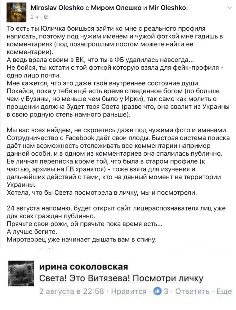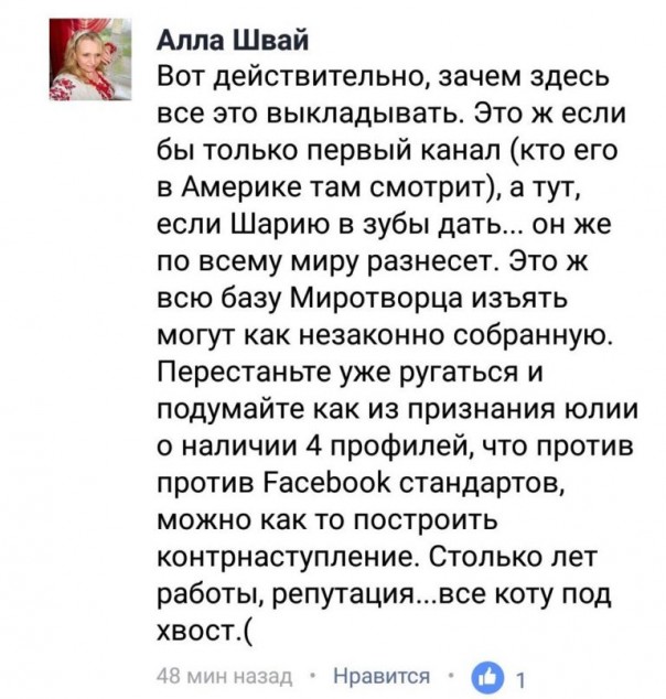 Теперь у нас есть официальное признание, что Фейсбук сливает данные «Миротворцу». Как мы его получили? Все очень просто. Не зря я всегда говорила, что длинный язык не в меру разговорчивых кастрюль их же и погубит! Зашла в ФБ с аккаунта подруги, чтобы хоть какую-то связь с нужными людьми из Киева иметь, так как все мои аккаунты в ФБ заблокированы стараниями подгузников Авакова и штатных стукачков на службе у СБУ, и тут такая удача. Вот что оно понаписало!