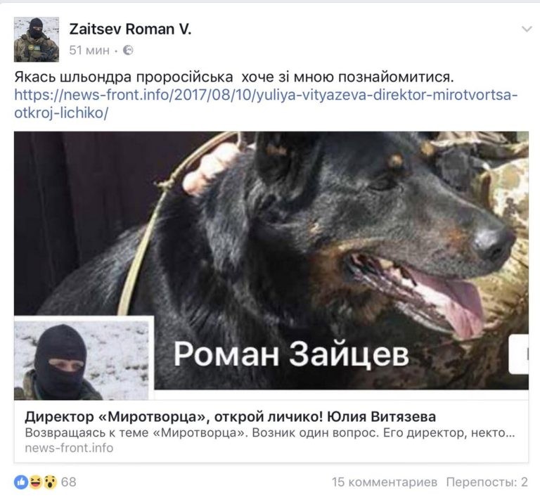 В противном случае есть все основания считать, что «Миротворец» — шарашкина контора, занимающаяся незаконным сбором и публикацией личных данных, руководит которой… овчарка. За которой прячется банальный трус, только и умеющий, что угрожать из фейсбука.