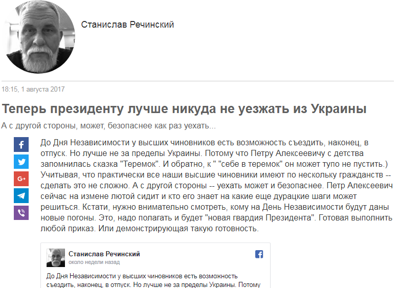 Естественно, такая позиция не может устраивать «партию войны», что следуют из заявлений Стасика Речинского, который является доверенным лицом Турчинова и ретранслятором позиции последнего.