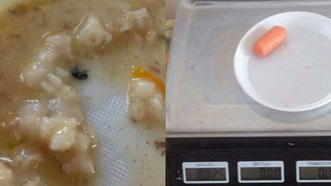 Он опубликовал фотографии, на которой изображены каша с мухами, «сосиска вместо мяса и хлеб непонятно с какими микроорганизмами».