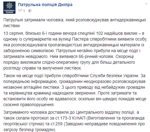 13 августа, около 18:00 в полицию поступил вызов, что в одном из супермаркетов на улице Пастера мужчина распространяет «пропагандистские антигосударственные материалы с запрещенной символикой».