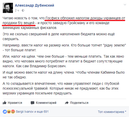 Эта простыня набрала 2 с лишним тысячи лайков за несколько часов. То есть чуваки, которые за три года опустили страну ниже плинтуса (и все, включая стадо двуногих, это прекрасно осознают), не стесняясь, рассказывают о том, как, оказывается, они построили десятки новых заводов, в 20 раз подняли прибыль госпредприятий... И самое упоительное - стадо лайкает. И никто из политиков, депутатов, блогеров, журналистов, политологов не реагирует даже. А чо? Нормально. Це Украина!