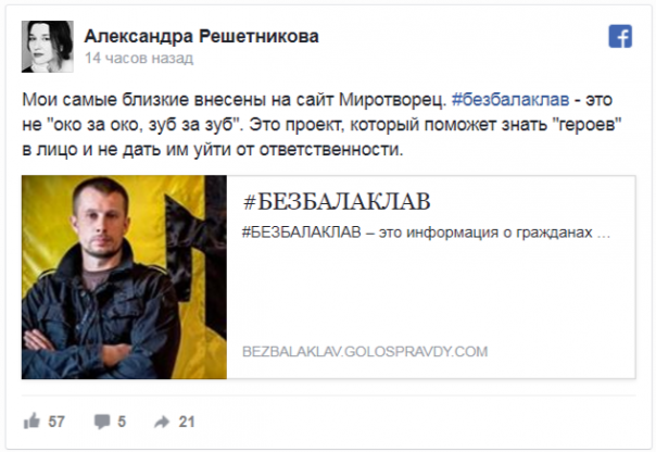 "Мои самые близкие внесены на сайт Миротворец. #БЕЗБАЛАКЛАВ - это проект, который поможет знать "героев" в лицо и не дать им уйти от ответственности", - отметила одна из пользователей.