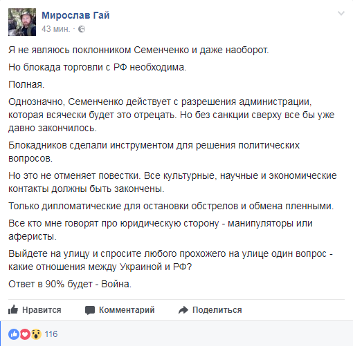 Семен объявил о готовности запустить второй сериал с блокадой: "Сейчас мы переходим ко второму этапу. Мы должны заставить (Рината) Ахметова прекратить финансирование террористов, мы должны положить конец тарифу "Роттердам +". За лето мы серьезно накопили силы, открыли ряд лагерей вдоль российской границы и готовы, если государство и в дальнейшем будет бездействовать в деле укрепления нашей обороноспособности, действовать, как представители гражданского общества".