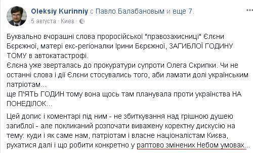 И злорадствовал по поводу смерти Бережной в автокатастрофе: