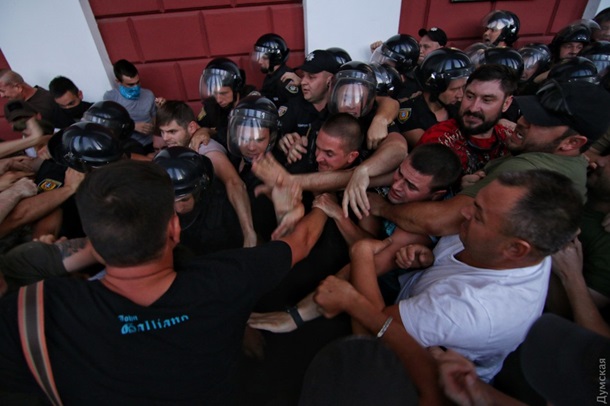 Под мэрией Одессы произошла драка во время штурма из-за пожара детского лагеря, в котором погибли три девочки; полиция применила газ, передает Думская.