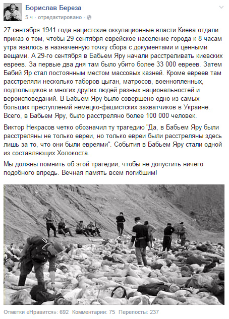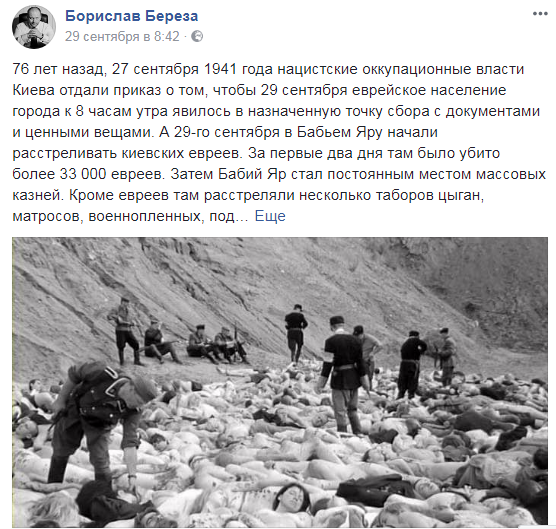 Борислав, помимо того, что бывший пресс-секретарь "Правого сектора", еще еврей и гражданин Израиля. И обратите внимание, какую фотографию еврей и гражданин Израиля ставит регулярно к своим постам в память о холокосте на Украине. Из десяти палачей на фото девять - украинцы.
