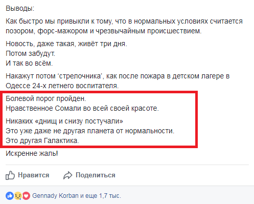 Помню, когда наших ребят московиты зажали под Иловайском, под министерством обороны собрался митинг с требованием срочно что-то сделать и всех там спасти. Я пришел тоже - уже день как вернулся с востока с простреленной рукой - и я увидел под министерством толпу здоровых мужчин, которые визжали, как испуганные свиньи. Там была "самооборона" в камуфляже, там были рядовые граждане, там был шоумен Андрей Дзиндзя - все они были готовы вот прямо сейчас чуть ли не штурмовать Генштаб, если Генштаб сейчас же не сделает чудо. Хотя для спасения ребят надо было не в Киеве во Минобороны кричать (у которого и так тогда было дел по горло, фронт сыпался, затыкать дыры было тупо никем), а идти на мобилизационные пункты.