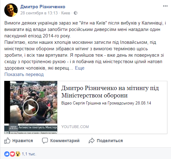 "Требования некоторых украинцев сейчас же "идти на Киев" после взрывов в Калиновке и требовать от властей предотвратить российские диверсии мне напомнили один скверный эпизод 2014-го года.