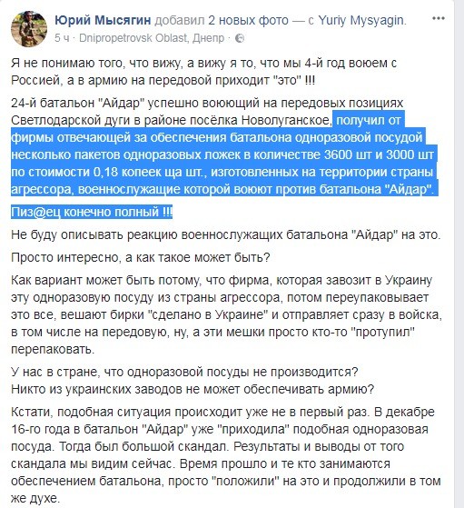 Тут у чуболобых дегенератов, ой, простите, украинцев, которых нельзя обижать новая зрада нарисовалась, и весьма смешная, как я погляжу. Воюющим уже четвертый год, как они, дегенераты чуболобые думают, с Россией выдали одноразовую посуду … да, вы угадали, российского производства. По иронии судьбы одноразовая посуда досталась скачущим животным из батальона «Айдар», которые особенно долго воюют с Путиным, только почему-то на Донбассе.