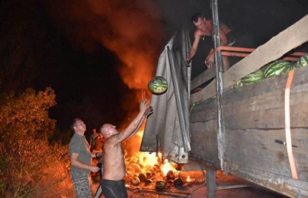 Губернатор Херсонской обл. Гордеев А. участвует в тушении арбузами горящей фуры с арбузами.