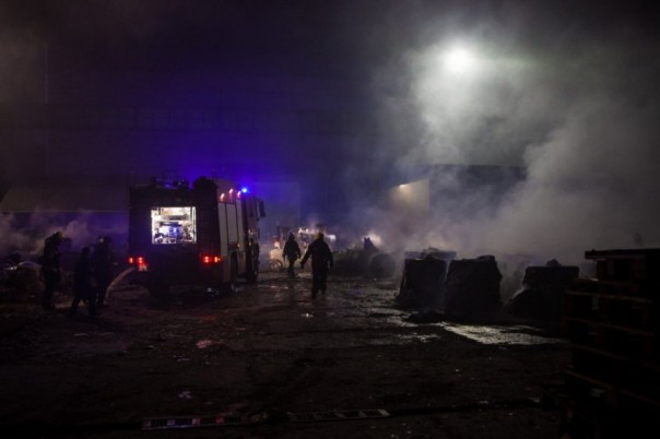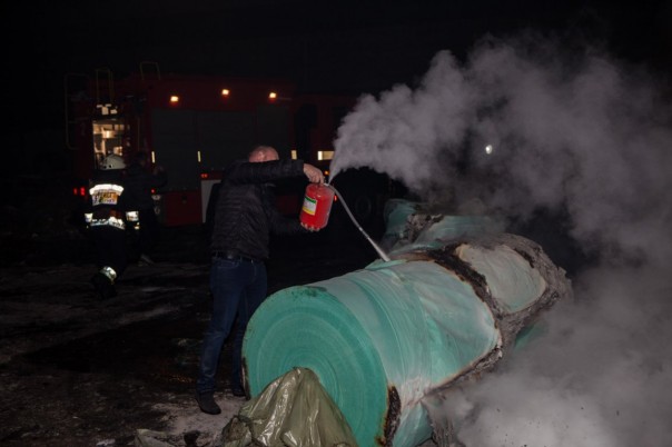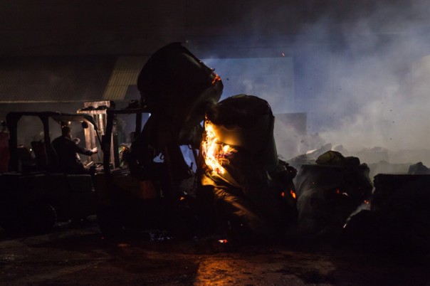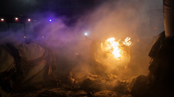 Тушат пожар не только спасатели, но и рабочие завода. Они на погрузчиках вывозят огромные рулоны туалетной бумаги, охваченной огнем, и уже вне здания задувают огонь из огнетушителей. Впрочем, это помогает только на время: бумага тлеет внутри рулонов и вспыхивает снова.