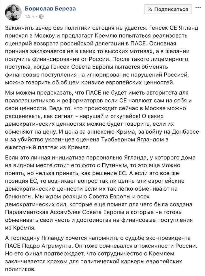 Безусловно, эта новость вызвала бурную реакцию на Украине. Генсек СЕ тут же был обвинён в личных симпатиях к Путину. А член украинской делегации в ПАСЕ Берёза напомнил, какая судьба постигла бывшего президента данной организации и намекнул, что «могут повторить».