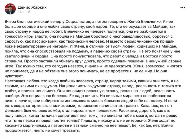 Она говорит, что "в отношениях двух родственных стран и культур создана искусственная проблема войны народов. В ней виноваты все, обе власти и оба лагеря медиа, все, кроме простых людей". Правда?! А кто тогда выходил на майдан?! Кто жёг "ватников" в Одессе?! Кто пошёл убивать на Донбасс?! Кто, как не "простые люди", которые по мнению Жени ни в чем не виноваты?!