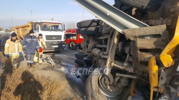 После грузовой автомобиль догнал маршрутку и въехал в ее заднюю часть. Водитель, чтобы избежать большого количества пострадавших, вывернул руль вправо и перекинул грузовик.
