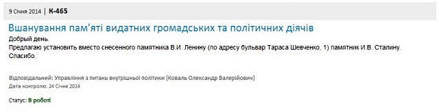 В Киеве, на месте снесённого памятника Владимиру Ленину (бульвар Тараса Шевченко, 1) на Бессарабской площади жители столицы предлагают установить монумент Иосифу Сталину.