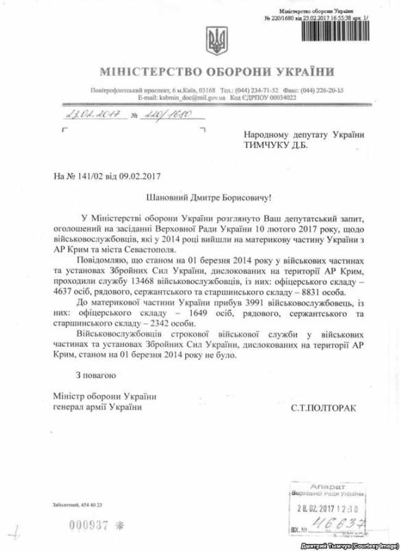 «Сообщаем, что на 1 марта 2014 в воинских частях и учреждениях Вооруженных Сил Украины, дислоцированных на территории АР Крым, проходили службу 13 468 военнослужащих, из них: офицерского состава — 4637 человек, рядового, сержантского и старшинского состава — 8831 человек. На материковую часть Украины прибыл 3991 военнослужащий, из них: офицерского состава — 1649 человек, рядового, сержантского и старшинского состава — 2342 человек», — указано в документе (смотрите скрин ниже).
