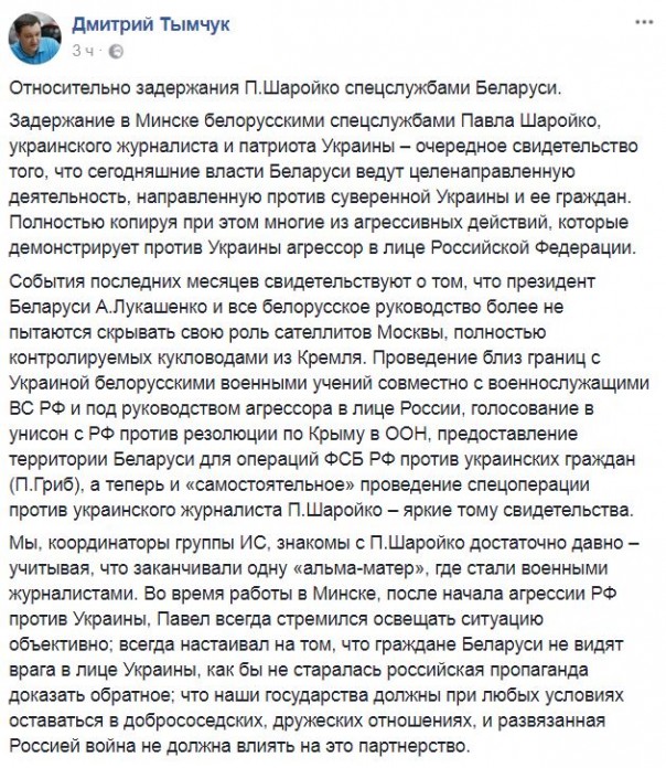 "Мы, координаторы группы ИС, знакомы с П.Шаройко достаточно давно – учитывая, что заканчивали одну "альма-матер", где стали военными журналистами. Во время работы в Минске, после начала агрессии РФ против Украины, Павел всегда стремился освещать ситуацию объективно; всегда настаивал на том, что граждане Беларуси не видят врага в лице Украины, как бы не старалась российская пропаганда доказать обратное; что наши государства должны при любых условиях оставаться в добрососедских, дружеских отношениях, и развязанная Россией война не должна влиять на это партнерство" - пишет Тымчук у себя на Facebook.