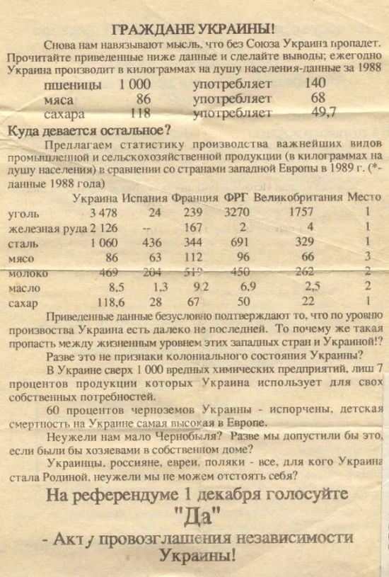 Интересно, что на единственном за всю историю существования СССР Всесоюзном референдуме в марте того же года за сохранение СССР проголосовало 70,2% тех же украинцев, а за вхождение Украины в состав Союза Советских суверенных государств, утвердительно ответили 80,2 % проголосовавших. Понадобилось всего полгода, неудачная попытка ГКЧП сохранить великую страну и активная пропаганда руховцев, обещавших гражданам Украины золотые горы, чтобы обыватели изменили своё мнение.